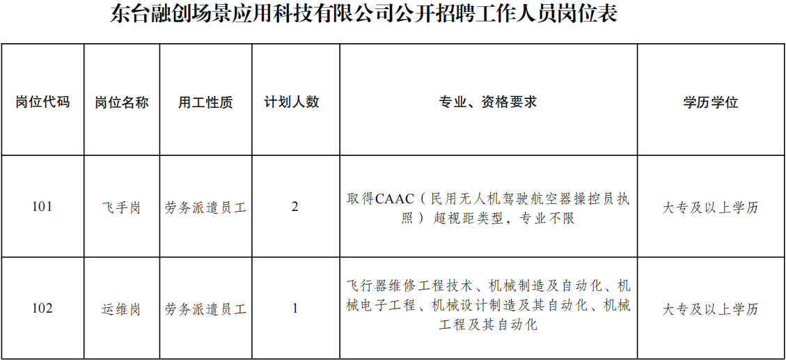 東臺融創(chuàng)場景應(yīng)用科技有限公司為東臺國資集團控股、無人機行業(yè)龍頭聯(lián)合飛機參股的江蘇國聯(lián)空域科技發(fā)展有限公司下屬全資子公司,是低空經(jīng)濟產(chǎn)業(yè)發(fā)展重點企業(yè),現(xiàn)因發(fā)展需要面向社會公開招聘工作人員,具體事項公告如下。